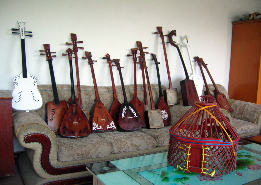 蒙古琵琶,弹拨类弦鸣乐器。音箱呈瓢形,薄木板盖面。板面左右各开一月牙形音窗,边沿绘民族图案,下部两侧绘云卷图案,头部较长并向后弯,左右各设弦轴两个。颈部设四相、十三品,张丝弦四根。常用以独奏或歌舞伴奏。古代宫廷乐队亦曾用。原为匈奴乐器。汉·刘熙《释名·释乐器》载:“批把(琵琶)本出于胡中,马上所鼓也。”