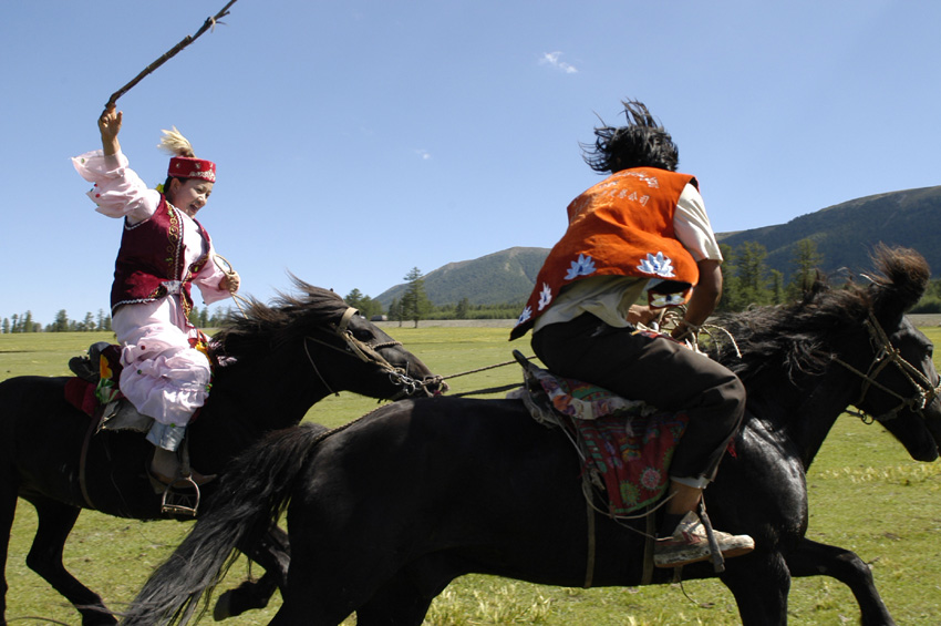 哈萨克族,有一种传统的马上游戏——叼羊。据说,这种游戏最早是从阿勒泰一带发展起并传播开来。直到如今哈萨克族仍然把它继承了下来,成为了彰显了哈萨克族优秀民族文化不可或缺的形式之一。