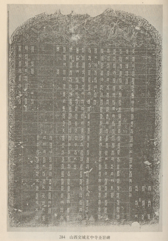 元朝皇帝颁发给玄中寺安僧录的护敕。文末署“牛儿年正月二十五日”。研究者大多认为,圣旨为忽必烈所颁发,但对颁发年代众说不一,小泽重男以为1265年,李盖提以为1289年,照那斯图认为1277年或1289年(可能是前者)。参见小泽重男《山西省交城县石壁山玄中寺八思巴文字蒙古语碑文的解读》,载《东京外国语大学论集》9 (1962年,3月);李盖提《蒙古语文献集》Ⅲ,布达佩斯,1972年;照斯那图《关于玄中寺八思巴字蒙古语圣旨碑刻》,载《民族语文》1986年第6期。