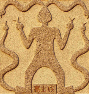 高山族是中国大陆对台湾地区南岛语系各族群的一个统称。高山族的族源与中国古代的百越有着密切的联系,在其世代相承的传统习俗中有许多古越人的典型文化特质,如巢居、舟楫、断发文身、凿齿、穿耳、跣足、木鼓、崖葬、龙蛇崇拜等等,都印证了高山族与古越人的风习相近,文化传承同出一脉。