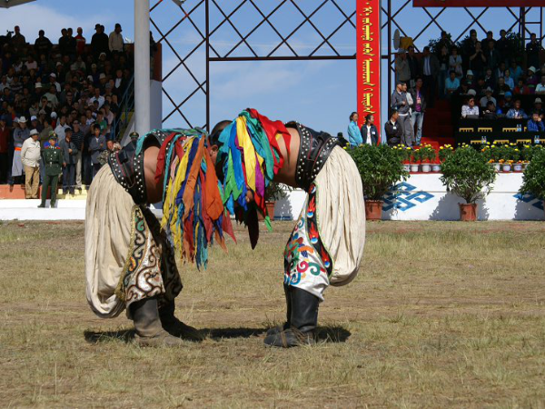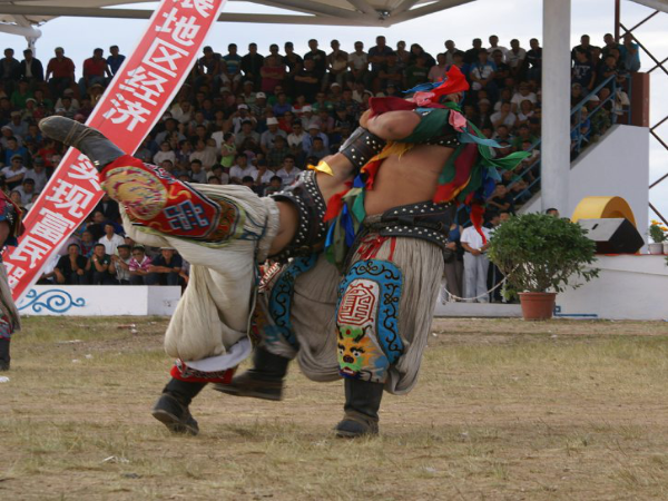 比赛开始的入场仪式别有趣味。身材魁悟、体态稳健、身着金光闪闪的蒙古服装的摔跤手排成竖行,腰胸挺直,两臂平伸,慢悠悠地上下摇动,好似雄鹰展翅,显得格外健壮,伴随祝福和掌声欢跳到主席台前,双手拍在膝上作鞠躬礼。