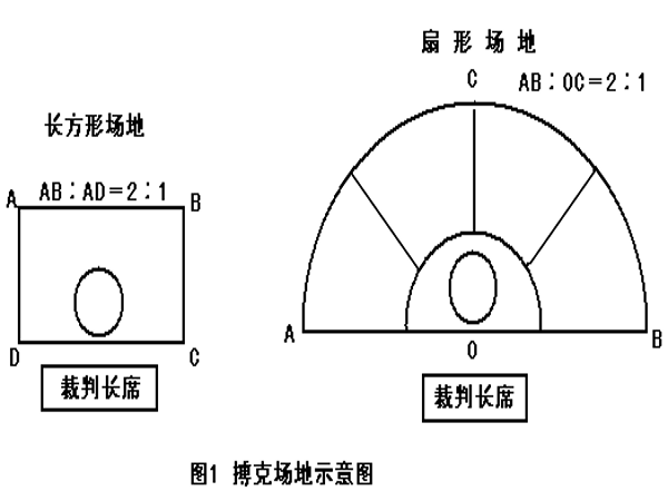 如有三个以上场地,则应按放射形成或扇形布局;长方形场地以并列平行布局;推圈决胜场地:2。5米为半径的圆圈,由线的内沿算起。(图1)