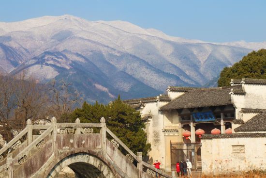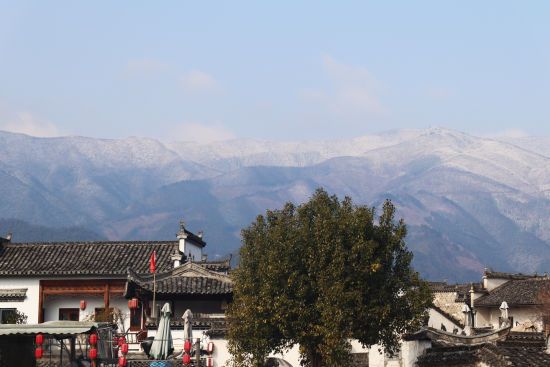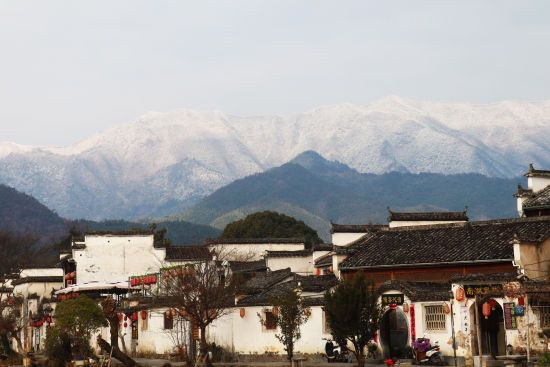 粉墙黛瓦的徽派古民居,在远处白雪覆盖的群山掩映下,宛如一幅素装淡雅的水墨画,散发着浓郁的诗意,景色非常迷人。