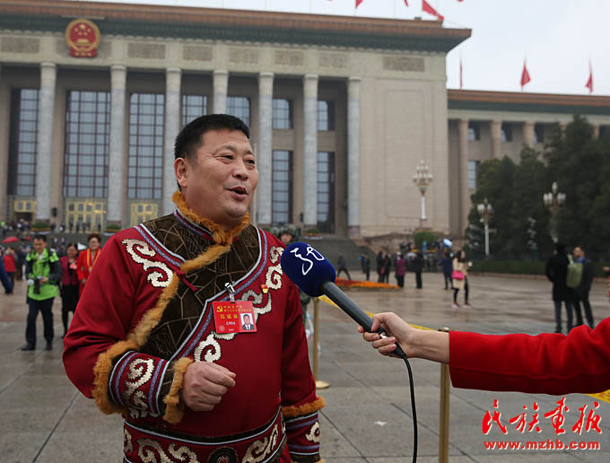 十九大代表尤明国(赫哲族)在会议期间接受记者采访(滕俊 摄影)