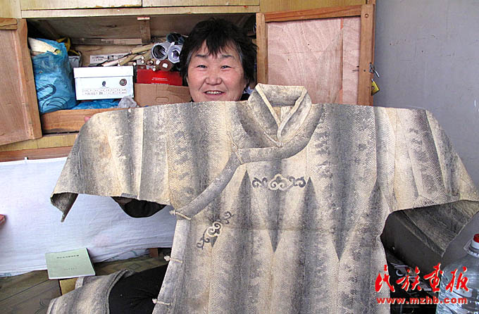 鱼皮服饰是赫哲族鱼皮文化的重要组成部分,其制作工艺十分精巧,是赫哲族独有的民族服装(袁东平 摄影)