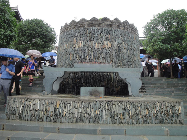 而坪坦古侗寨最出名的不是那远远就能看见的鼓楼而是这里有着世界上最大的萨岁坛。当穿过古老的风雨桥后,一块写着“中国侗族萨文化乡”的大石头被矗立寨子前,让整个寨子一看就知道萨文化很是浓郁。平整的小石块,一块块堆砌在一起,形成高两米多的石圆柱,顶部用小石子砌成一个个三角形,像个皇冠状围绕在一起。旁边栽种着两棵树,前面有块大理石的祭台,这就是萨岁坛。据了解,在侗族历史上出现过一位名叫婢奔的女英雄,人们尊称她为萨岁或萨玛,认为她的神威最大,能主宰一切,保境安民,使六畜兴旺,村寨平安,几乎村村都设有她“神坛”。