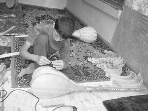 冯程指着满屋挂着的乐器说:“都塔尔的名字来源于波斯语,‘都’意为‘二’,‘塔尔’是‘琴弦’之意。所以,都塔尔就是两条弦的乐器。”传统的都塔尔,构造和弹拨尔差不多,外形都像个长柄的大水瓢,用干燥的桑木、杏木和核桃木制成。买买提依明·阿巴拜克里接下来就是用杏木制作琴杆和琴柱。他画出琴杆、琴柱的样式,然后用小锯子锯出琴杆,接着把它放进了水里。这使我很惊讶:“这杏木好不容易才晒干,怎么又要放进水里呢?这不是前功尽弃了吗?”他笑道:“没有关系,这样做出的琴杆才结实。”只见他又拿出一把小刀,按照画好的琴柱形状飞快地削起来。