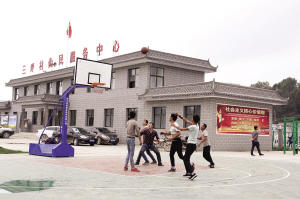 在三坪村新建的文化广场上,村里的年轻人正在打篮球。