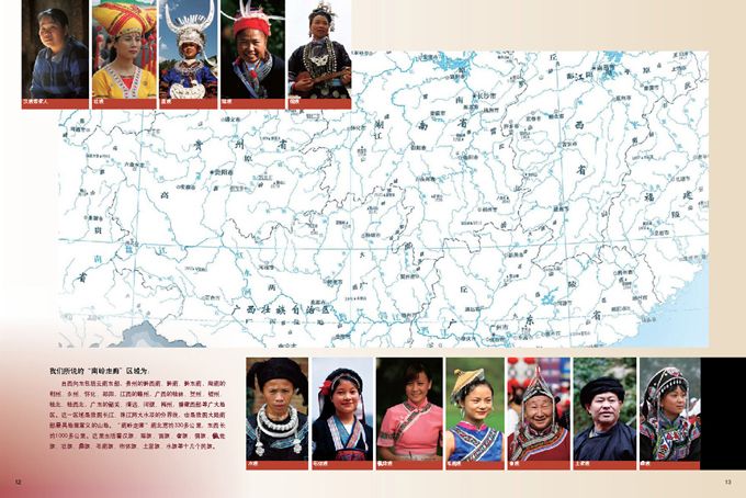 自西向东包括云南东部,贵州的黔西南、黔南、黔东南,湖南的郴州、永州、怀化、邵阳,江西的赣州,广西的桂林、贺州、梧州、桂北、桂西北,广东的韶关、清远、河源、梅州,福建西部等广大地区。这一区域是我国长江、珠江两大水系的分界线,也是我国大陆南部最具地理意义的山地。“南岭走廊”南北宽约330多公里,东西长约1000多公里。这里生活着汉族、瑶族、苗族、畲族、侗族、佬族、壮族、彝族、毛南族、布依族、土家族、水族等十几个民族。