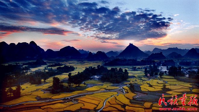 起伏的山峦,绯红霞光映照丰收的金色大地。(廖丹宁 摄影)