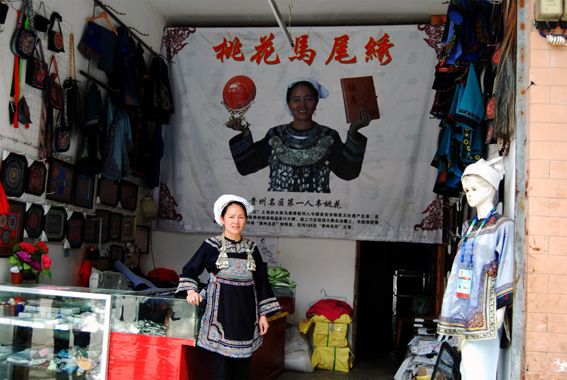 韦桃花无疑是幸运的,2006年6月,有“刺绣的活化石”之称的水族马尾绣被列入首批中国非物质文化遗产名录。加上,近年来,三都对民族民间文化保护力度的不断加大,提出了以“民族文化塑县,打造三都旅游经济”的战略目标,旅游经济的发展让原先自给自足的马尾绣自动转化为旅游商品,大大地刺激了马尾绣的生产和销售,也为韦桃花工艺品店的发展营造了良好的大环境。2006年8月末, “开磷杯”多彩贵州旅游商品设计大赛、能工巧匠选拔大赛在贵阳举行。韦桃花在总决赛上凭一手精美的马尾绣夺得“贵州名匠”特等奖,位列100名“贵州名匠”之首。2007年10月被贵州省文化厅授予她“贵州省非物质文化遗产传承人”称号,2008年8月8号,韦桃花代表水族来到北京,在奥运村的祥云小屋里,向全世界的人们展示水族马尾绣的非凡魅力。从此,韦桃花和她的马尾绣工艺品店一路风生水起。