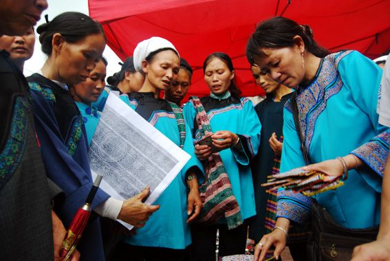 韦桃花每场都要到三洞乡去收购马尾绣,她说平均一场要收个近万元的货。现在板龙寨所有的水族妇女都在跟她做马尾绣,为提高她们的制作技能,她还免费提供伙食,到板龙寨搞了一期马尾绣制作培训班。一条有生产有销售的马尾绣营销网络正逐步形成。今年,时值新中国成立60周年,高速铁路和高速公路在今年同时过境三都,为这个全国唯一的水族自治县带来了新的经济增长点插上腾飞了的翅膀。今年也是韦桃花和她工艺品店迎来大发展的一年,马尾绣正逐渐从民间从上了更为广阔的层面,从而让马尾绣这种古老而独特的民族手工技艺得以发展,并在发展中得到更好的传承。
