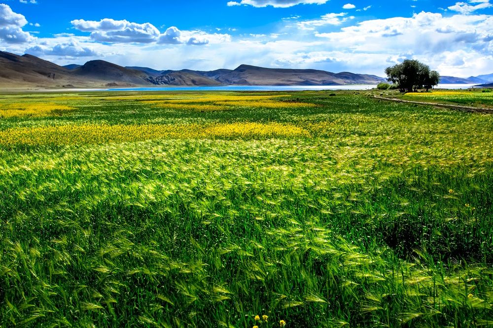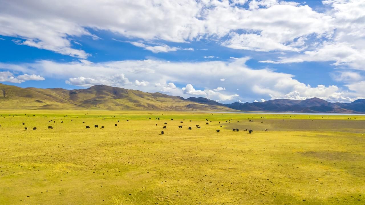 在羊卓雍措四周,土地平坦,土质肥沃,水草鲜美,牛羊马群广布。