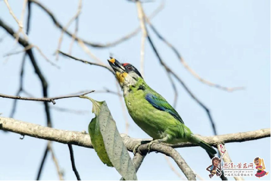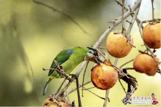 图片中,一只额深红色,头顶金黄色,后枕具一大块深红色斑,耳羽和头侧银灰色,上体草绿色,颏和上喉金黄色,下喉淡银灰色,其余下体淡黄绿色的金喉拟啄木鸟一会在柿子枝头啼鸣、一会啄食柿子,在柿子树上飞来飞去不停雀跃。