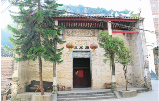 三界庙位于土司祠堂东侧不远处的中和街南巷,是莫土司衙署建筑群的重要组成部分。寺庙坐南朝北,占地面积约 2000平方米,由大门、戏台、正堂大殿、方丈住所及院落组成。大门廊檐有两根方形石柱,各高 5.6米,柱脚为青石盘,盘高 0.62米,凿工精巧。大门门楣上书“三界庙”,门楣上方和山墙两内侧分别绘有“乡山九老”等画像,画像人物形态生动,栩栩如生。据传昔日两扇门板上分别绘有宋将杨宗保及穆桂英画像。入大门,为三开间,上层镶木板作楼,楼南面留空敞亮,作演戏台。北侧大门和南侧戏台构成一座建筑,建筑面积约 144平方米,青砖绿瓦,屋脊上有双龙戏珠石雕。戏台南面为四方院落,可供观众摆凳看戏、设坛斋醮祭祀和举行道场活动。院落南面是正堂大殿。大殿建筑面积约 168平方米。大殿屋顶浮雕图案精美,造型栩栩如生。大殿中的柱梁皆为大格木制成,漆成朱色,堂皇典雅。大殿中央设有神台,放置三界公神像。神台前面是行香祭祀活动场所,两旁种植的松柏、石榴树龄已达 300余年,见证庙宇的悠久历史。