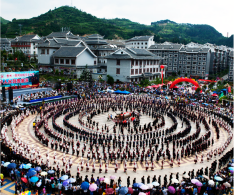 苗族的板凳舞主要流行于贵州革一、后哨、大塘、台盘等地。是在走亲访友时,妇女们酒后随兴而起的一种舞蹈。舞蹈场地不限,或在某家里,或在寨坝上。这种舞蹈的伴奏乐器主要是板凳,因而得名板凳舞。舞蹈时有两种跳法。一是由一名妇女敲击板凳,其余妇女围圈用双手随节拍拍手,双脚轮换边歌边舞。歌词内容结合活动内容随兴而编,但大多歌词是围绕攀亲内容而唱。另一种板凳舞是参加舞蹈之人每人双手各持一只凳子,集中在较宽的坝子上,一起围着圈子转跳,舞蹈动作是先走右脚用脚踉向外、前点两点,与此同时双手的板凳也击两下,之后收左脚向内、前点两点,双手板凳也即拍两下。如此反复几遍后,圆圈队形又逐渐转换为面对面并列两队形。舞蹈动作基本同前,舞时两对面伸出右手持板凳相互击一下,又换左手相互击一下,二人在做这两个动作时,各自的右、左脚跟也互换点地。之后,面对面各自转身向外斜成“弓”字形击了两下,与此同时二人屁股相撞,百褶裙子飞扬。如此反复几遍后,各人又边击板凳,双脚同时起跳如蛤模跳跃状,一边手击板凳,一边与其他舞蹈妇女用臀部东击西碰。如此反复狂舞,直到兴尽方休。