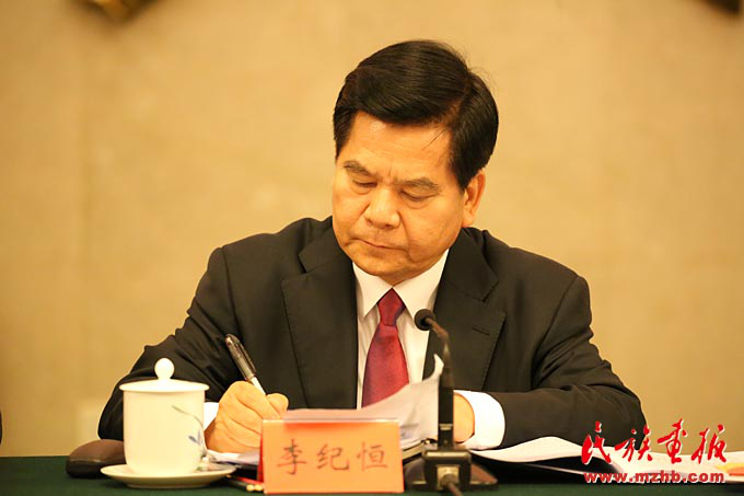 内蒙古自治区党委书记李纪恒代表发言并认真记笔记