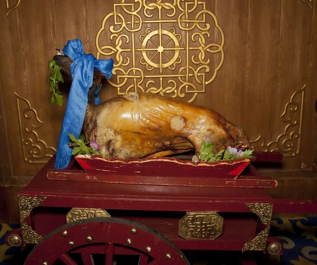 阿拉善王府烤全羊吸收了北京“焖炉烤鸭”技法,形成独特烹饪技艺。2008年6月,阿拉善烤全羊被列入第二批国家级非物质文化遗产名录,是最知名的非遗食艺。
