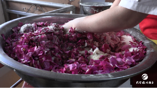 第一步就是采摘和挑选新鲜的花瓣,洗净后和白糖、蜂蜜、猪油一起拌成馅料;