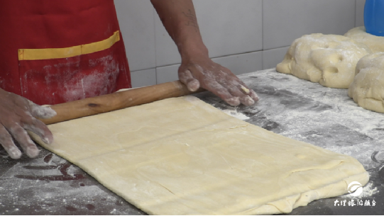 第三步是和面、擀面。原料有面粉、鸡蛋、黄油、白糖、水,面揉好之后,就是擀面啦!擀成面皮之后就可以准备做饼啦!