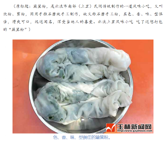 今年6月,蔡龙飞、周朝贵在玉林城区的美林街开了一家石磨手工粉店。为了保持原来的风味,专门请来了黄六师傅,手把手地全程传授、指导制作簸箕粉,制作工具、工艺完全按照传统的方式方法。开业以来,深受众多消费者的追捧,尤其是在玉林城区工作生活的北流上里人。现在每天早上和下午各制作一批,共300多条粉,好多人吃了还要打包回去给家人朋友分享,往往来晚的顾客就吃不上簸箕粉了。一位白马镇83岁的老大爷,随儿子在玉林城区生活,有一次儿子打包簸箕粉回去,他一口气就吃了4条,老大爷感慨得热泪盈眶:“我30多年没有吃过这簸箕粉了,居然还是当年的味道!”两位年轻人现在又着手在玉林、北流城区开几家分店,即将以连锁加盟的方式来发展壮大,把家乡的小吃打造成一个远近闻名的连锁品牌。