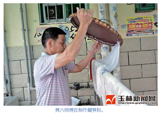 在广西玉林北流市白马镇、大伦镇,提起制作簸箕粉的黄六师傅,几乎妇孺皆知。家住大伦镇大伦村大樟队的黄六师傅,本名叫黄祖福。新中国成立前,其祖辈就开始制作簸箕粉,在当地远近闻名。20世纪70年代初,12岁的黄祖福就开始跟随父亲黄纶绍制作簸箕粉。经过四十载的风风雨雨,其手艺相当娴熟,深得制作簸箕粉的精髓。黄六师傅做的簸箕粉皮白如雪,晶莹剔透,厚薄均匀,薄而有韧性,爽滑而不腻。黄六师傅回忆道:“那个年代,每天半夜两三点钟全家人就开始忙碌了,天刚蒙蒙亮,父亲就用箩筐挑着一担簸箕粉去赶圩。”当时人们物质生活很缺乏,为了解馋,能够吃得上一次簸箕粉算是很奢侈的事了。当时没有花生油,只是加一点猪油和酱油就非常美味了。90年代末,黄六师傅的父亲临终前嘱咐他:“虽然做这行不能让你们大富大贵,但是维持生计是不成问题的,你们一定要把这手艺传承下去。”