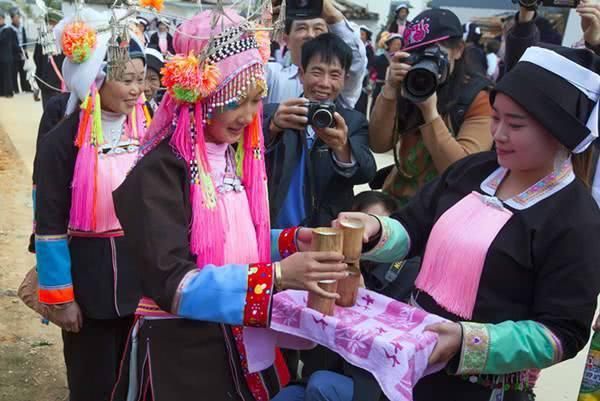 居住在巴马的蓝靛瑶,至今一直保留着古老而具有浓郁的民族特色的婚俗。蓝靛瑶男青年找对象,—般通过两个途径:一是由年轻人自己与姑娘对歌、抛绣球以及平时交往自由选择,二是由父母亲属在各种场合中代为选择。相中如意的姑娘后,由父母派媒人前往女方家提亲,如女方同意,即交生辰八字给媒人带回,男方父母将男女双方之八字给算命先生推算,认为双方合适做夫妻,男方即给女方家一些钱和糖作定礼。