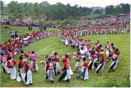 花山节是苗族的传统节日,滇中一带的苗族每年农历五月初五是苗族的花山节。花山节历史悠久,相传在中华大地古老的部落时代,因部落之间的争夺,苗族首领最后被战败,失去优势条件的苗家背井离乡,辗转迁徙,失散亲人。为了唤醒重新的团聚,苗族人民选择一座高山,在山顶立起一根挂着红绸的花杆,人们围着花杆吹着芦笙,跳起时而悲伤时而欢快的芦笙舞,离散的亲人看到花杆听到芦笙后相互转告,从四面八方纷纷前往花杆场与同胞相聚,顿时,山上人山人海,失散已久的亲人又得到了重新的团聚。这样,每到农历五月初五这一天,苗族同胞就选择一块空旷高地立起花杆,围着花杆吹起芦笙跳起芦笙舞,年复一年,形成了苗族传统的节日“花山节”。