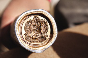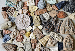 我在曼谷一家有40年历史的佛像店“佛光工艺社”采访时问到老专家这样一个问题:泰国现在大概有多少种图案的帕肯?所有听到这个问题的人都是一声惊叹,然后笑说:“无数!”我非要问出个数来,他们便告诉我,泰国是一个历史划分复杂、族源广博的国家,因此其包容性很强,虽然九成以上的人信仰佛教,但是婆罗门教、道教、伊斯兰教、基督教等在泰国都被接纳,还有本土的一些法术也不曾被丢弃。所以,每天每个来定做的人都会有不同材质的要求,不同图像、符咒的组合,仅一个工艺社40年来就已经做过几十万种的图案组合。我收藏的擦擦有不同年代、不同材质、不同价值的,除去年代久远的,颇有价值的就是一个药擦,那是一个大威德金刚擦,专家说从被剥落的剖面看,里面有药材的成分。我知道,在西藏,擦擦因材质和制作人不同而有很大的区别。擦擦中最为稀有难求的一种叫“布擦”,那是寺庙僧人在保存活佛法体的时候,将那些浸透活佛法身血水的盐巴或其它药物和泥土融合后制成的。另一种较为珍贵的擦擦是活佛的骨灰与泥土掺混在一起制作而成的。还有一种药物擦擦,是用不同的名贵药材如珍珠、玛瑙、藏红花等藏药合成制作,可服用治病。最普通的擦擦用一般的泥土制作,好一点的有胶泥、陶土、白泥等,这种擦擦成本低廉,在民间流传最广。