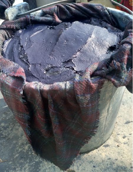 搅拌结束,经4小时静置,蓝靛沉淀于池底,打开闸门上面的排水孔放出废水。之后,打开排蓝靛聚孔,蓝靛沿着导管经过滤进入虑靛池,继续分离水分,每24小时打开小孔排出上层废水,6天左右废水基本排完,就可以得到蓝靛膏成品。