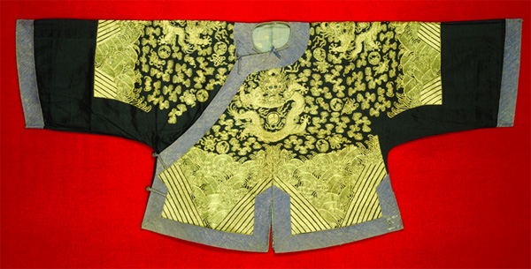 民族文化宫博物馆的这件石青色缎金丝织锦龙褂,是清乾隆皇帝赐予云南西双版纳车里宣慰使司的官服。其身长63厘米,两袖通长45厘米,袖口宽32厘米,下摆宽74厘米,后裾长70厘米,丝质。它以石青色绸地面料为底色,圆领,右衽大襟,平阔袖,四开裾,内衬灰色软绸。周身金线密布,绣有金龙、云龙纹、八宝、海水江崖纹等图案。整件龙褂共有4团金丝线绣制的五爪龙,分布于胸前、后背与两肩,龙首均为正面,前胸和背面相同,头部左右对称,双目圆睁,正视前方,蜿蜒而坐,故又称正龙或坐龙。团龙五爪,是龙纹中最为尊贵的纹饰。石青色绸面主题花纹还用金丝线绣有云纹,以及寓有“八宝生辉”吉祥之意的盘长、伞、盖、鱼、法轮、莲花、宝瓶、法螺等佛教八宝图案;下摆织绣象征寿如山高、福似海深的海水江崖纹。领口、斜襟上缝有四个盘扣,扣上缀有四枚圆形镂空铜纽扣。领口、袖口、前后襟边缘饰灰蓝色绸边。前后及左右下摆处各有16厘米的开裾。