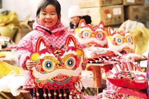 春节临近,山东省临沂市郯城县红花镇马圩子村加紧生产各类“萌虎”新年饰品,供应各地年货市场。图为一名小女孩展示虎年饰品。 新华社发