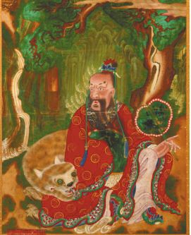 道教祖师张天师的坐骑即为黑虎,天师手持七星宝剑,驱邪逐祟,为人间除妖灭病,立德于世,位于江西鹰潭的天师府即镌刻着“道高龙虎伏,德重鬼神钦”的楹联。道教信仰的武财神赵公明也是坐骑黑虎,又称“黑虎玄坛将军”,凡经商者皆愿敬拜,以求招财进宝,辟邪祛灾。道教神系中地位至为高尚的西王母即王母娘娘是容貌慈祥端庄的大母神,但在早期文献记载中却是“其状如人,豹尾虎齿而善啸”的半人半兽形象,故西王母也称“黑虎女神”,据说她的使者和坐骑也是老虎。民间信仰中,虎是土地爷的坐骑,土地庙内常供奉老虎,叫做虎爷。大概因为虎八面威风、四方雄震,具有勇猛刚健的独特气质,所以被道教和民间尊崇为护法神、保护神,以镇邪扶正,护卫四方。