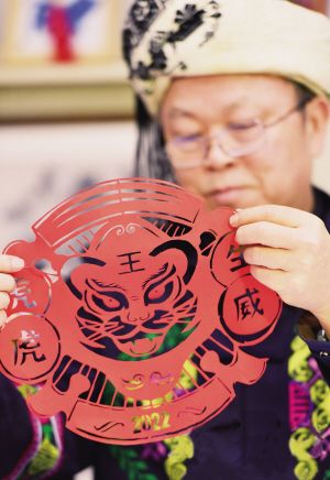 1月26日,在位于湖南省湘西土家族苗族自治州泸溪县的工作室中,“踏虎凿花”州级传承人李铁骑在展示作品。 新华社记者 赵众志摄