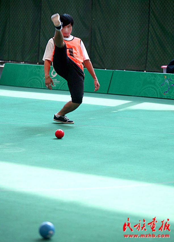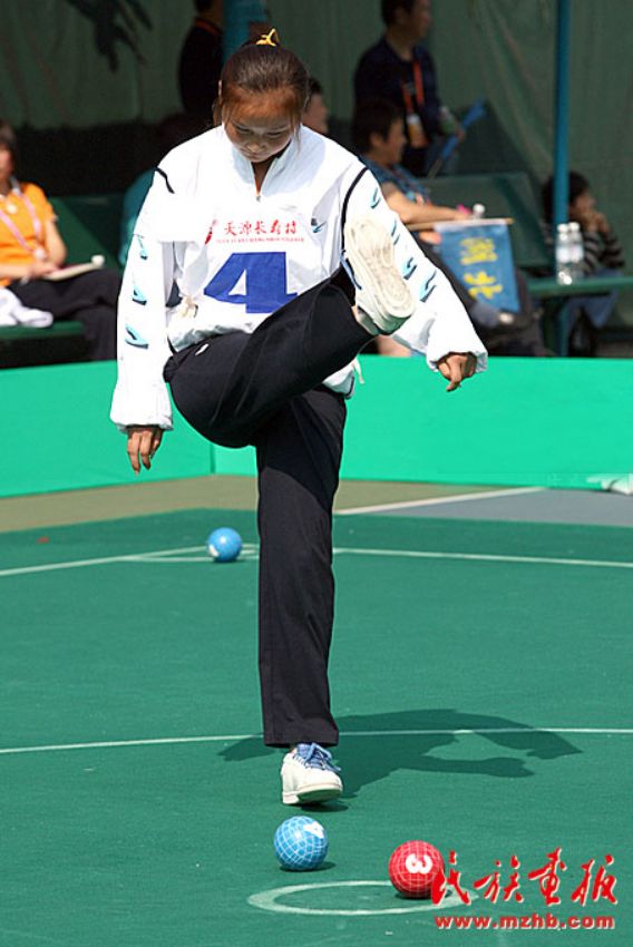 图为第八届全国少数民族传统体育运会女子单人蹴球比赛