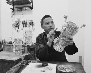 吴水根在工作室制作银饰。