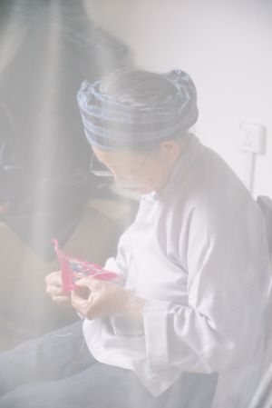 后来,我好几天都到黄奶奶家,希望她可以染布给我看,但似乎总是机缘不到。一天,在黄奶奶家午睡醒来,隔着蚊帐,看见她侧对着我正在绣花,沉浸在一片温柔的光晕里。那是黄奶奶的另一项手艺,绣有龙凤、狮子、蝴蝶、花朵、螃蟹这些吉祥花纹的绣片,会用在小孩背带上,保佑他们健康长大。家里每个出生的成员都受到美和爱的环绕。