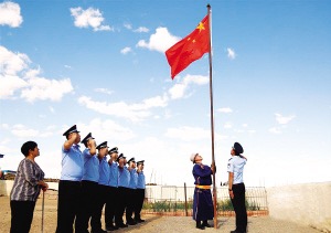 阿迪雅(右二)、妻子娜仁其其格(左一)与内蒙古出入境边防检查总站包头边境管理支队满都拉边境派出所民警在院子里升起国旗。 冯楚帆摄