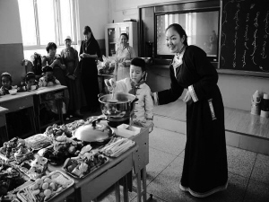 图为孩子们在上传承民族文化特色展示课。奶茶原为中国北方游牧民族的日常饮品,至今已有千年历史,蒙古奶茶至今仍然是日常饮用及待客的必备饮料。陈巴尔虎旗民族小学开展了具有浓浓的民族风味的实践活动课,通过一起熬制奶茶,学生和家长、老师们都受益匪浅。