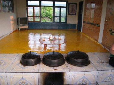 朝鲜族传统民居建筑主要采用烧炕的采暖方式。一般有多大的屋子,就有多大的炕,这点与东北地区的汉族与满族类似。一般在早上烧两灶就可以维持一天,冬天非常温暖,朝鲜族人们可以在炕上进行任何活动。