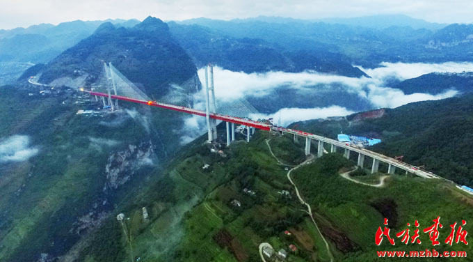 我国东西横线大通道杭瑞国家高速公路的关键节点——毕节至都格高速公路北盘江大桥。该桥桥面到谷底垂直高度达569.66米,为世界第一高(邓刚 摄影)