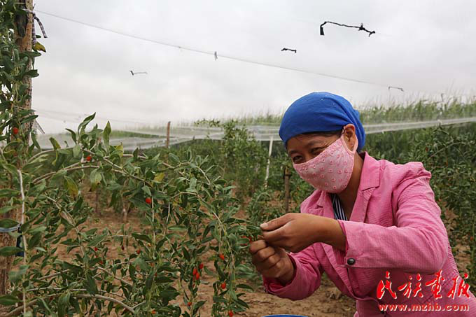 杨彩梅的二儿媳在摘枸杞,这里种植枸杞是农户增收的一大来源(曾颖 摄影)