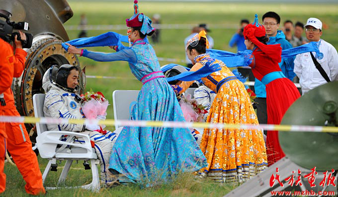 2013年6月26日,神舟十号返回舱平安返回,圆满完成任务的三位航天员张晓光、聂海胜、王亚平自主出舱后接受蒙古族牧民的祝贺(吴运生 摄影)