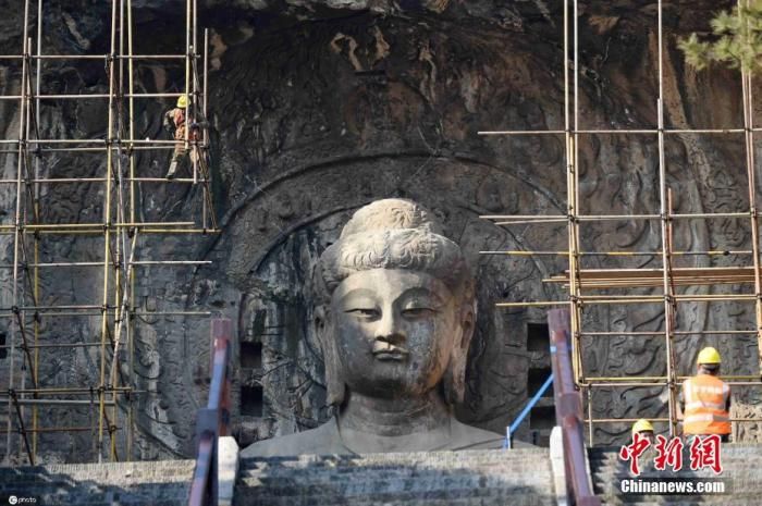 据龙门石窟研究院院长史家珍介绍,此次龙门石窟修复主要集中在奉先寺、擂鼓台以及受本年度降雨影响明显的万佛洞、古阳洞等洞窟,修复工作以渗漏水治理、危岩体加固为主。目前奉先寺前已竖起脚手架,工作人员正紧张施工。