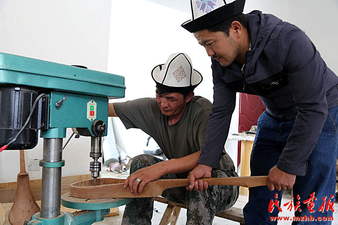 走进新疆克孜勒苏柯尔克孜自治州阿合奇县色帕巴依乡色帕巴依村,一排排房屋整齐有序,沿路花坛里开着叫不上名的花,蓝天映照下,颜色格外鲜艳。走进一间普通民居,一个柯尔克孜小伙儿正埋头打磨着一把木质乐器,这正是柯尔克孜族的传统乐器——库姆孜。房间里摆着一溜儿木质雕刻的半成品。