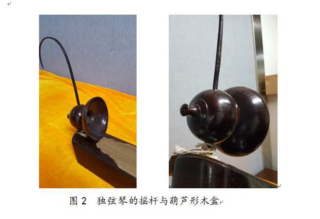 民族文化宫博物馆馆藏京族木质独弦琴,为京族民间传统乐器,属弹拨类弦鸣乐器,二十世纪七十年代征集于广西壮族自治区。独弦琴长101厘米、宽12.5厘米,木质。其主体为褐色漆木盒子,呈长方形,一端较窄,另一端较宽,中空,用多块木板拼合而成。琴的两端落地处呈马蹄形,中间悬空,为独弦琴的共鸣箱。琴面一端刻有云纹,上插一根弧形柱,柱呈圆形,从下至上逐渐减细,与琴身呈90度,为独弦琴摇杆。摇杆下端穿有葫芦形木盒,为独弦琴共鸣器。从葫芦形木盒中心有一条金属丝与琴身另一端的弦钮固定。演奏时,拨动琴弦和摇杆,在一根独弦上奏出复杂的乐曲。