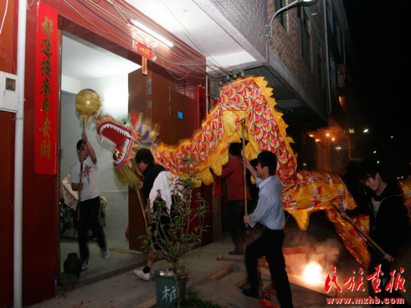 2009年,承启楼里共有11个人结婚,江胜洪农历二月结婚,是最早的一个,按常规他成为2010年元宵节舞龙的负责人。他说,一般舞龙队需要20个人以上,2个人负责打鼓, 4个人敲锣,近10个人舞龙,其他人轮换。