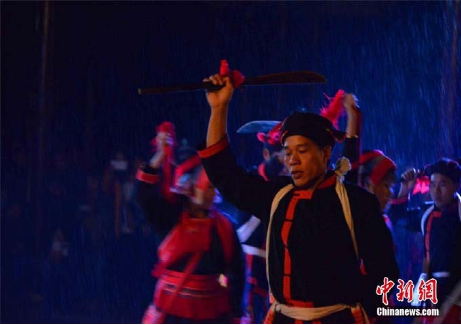 12月6日夜晚,在广西金秀瑶族自治县,瑶族百姓在盘王节上当地展现瑶族民间绝技——上刀山