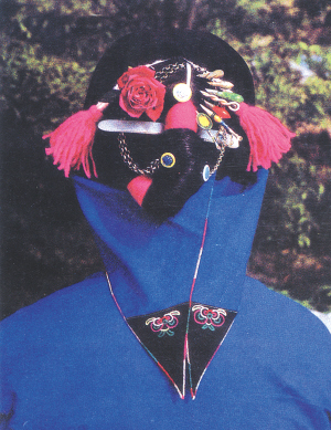 江南水乡姑娘有一种很独特的饰品,叫瞳裙和瞳腰头。瞳裙是长1.5尺的短裙,由两边合成,相互交错压叠,并在腰际折细裥100多个,俗称“顺风吊桅子裥”。瞳腰头是束在瞳裙外面的小围裙,也是用两种颜色以上的布拼成。水乡女子喜梳硬大的发髻,俗称“    头”。用银簪固定发髻,再在周围插上近10种花样银钗,如茉莉头、翻爬、佛手、锡仗等,并插珐琅彩半月形银梳和银链条,再插上四季鲜花或绢花,整套头饰鲜艳俏丽,妖媚动人。