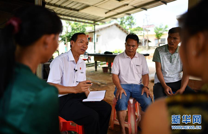羊风极(左)在海南省白沙黎族自治县打安镇田表村收集群众意见和建议